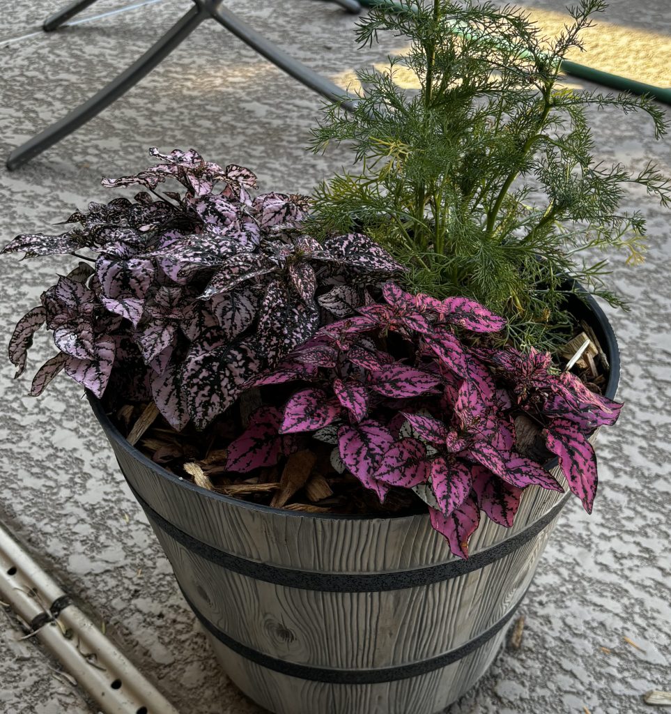 This type of spot is difficult to plant because we’re back to a limited palette of plants that are okay with this light exposure. However it’s also an opportunity to use a few plants that really can’t handle the sun here. The winter annual cyclamen is a good example. Other plants that can handle full shade include purple heart tradescantia (Tradescantia pallida) and the groundcover wedelia (Wedelia spagneticola).